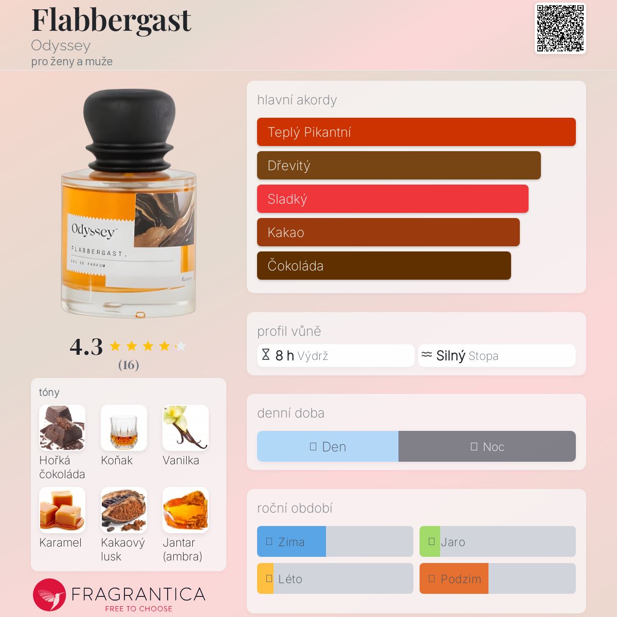 Flabbergast podle Odyssey je vůně pro ženy a muže. Toto je nová vůně. Flabbergast byl/a uveden/a v roce 2023. Vrchní tóny jsou Hořká čokoláda, Brandy a Karamel; střední tóny jsouVanilka, Kakaový lusk a Pačuli ; základní tóny jsou Vetiver, Jantar (ambra) a Dub.