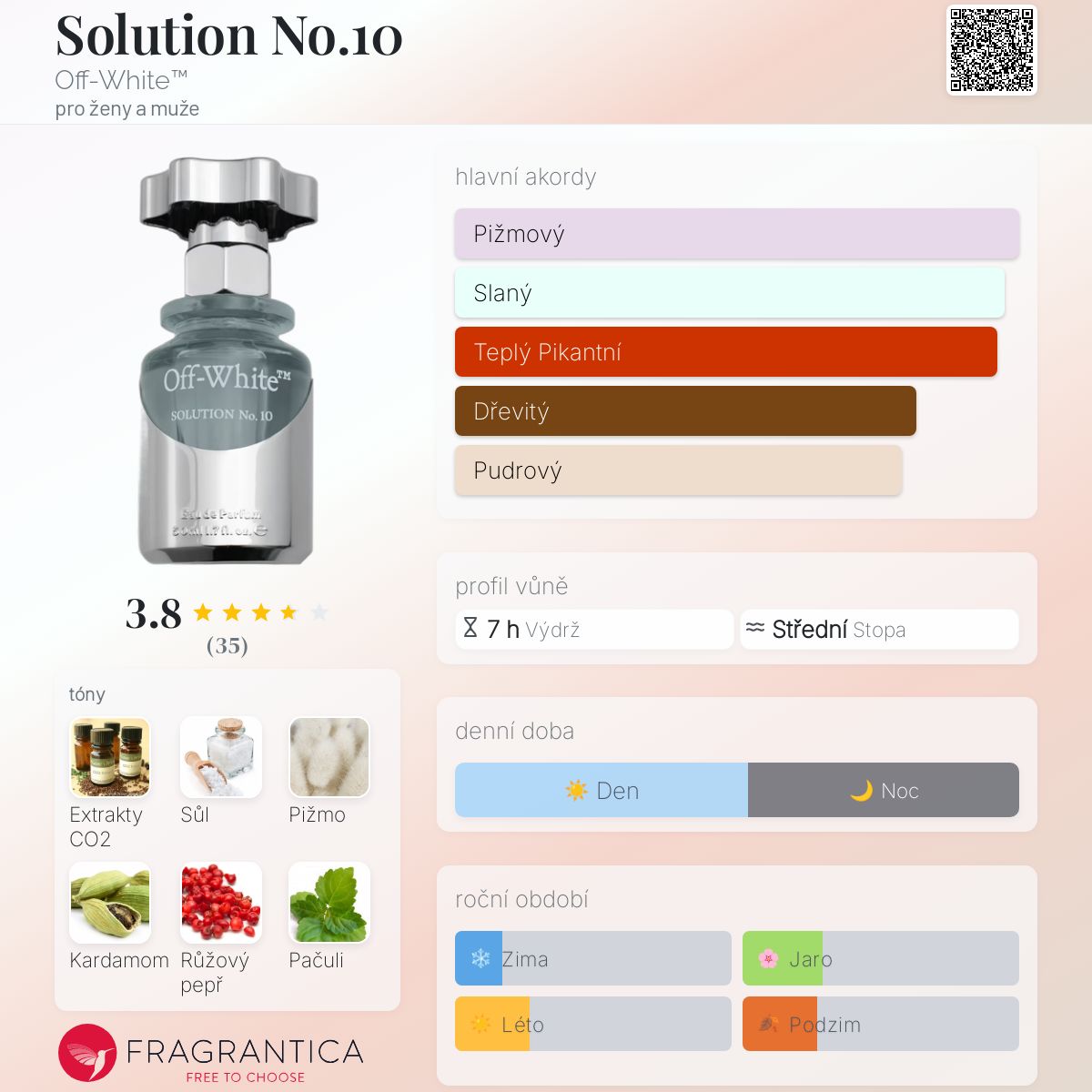 Solution No.10 podle Off-White™ je Woody Aromatic vůně pro ženy a muže. Toto je nová vůně. Solution No.10 byl/a uveden/a v roce 2024. "Nosem" za touto vůní je Sidonie Lancesseur. Vrchní tóny jsou Extrakty CO2, Kardamom a Růžový pepř; střední tóny jsouPačuli a Pomeranč ; základní tóny jsou Mořská sůl, Pižmo a Santalové dřevo.