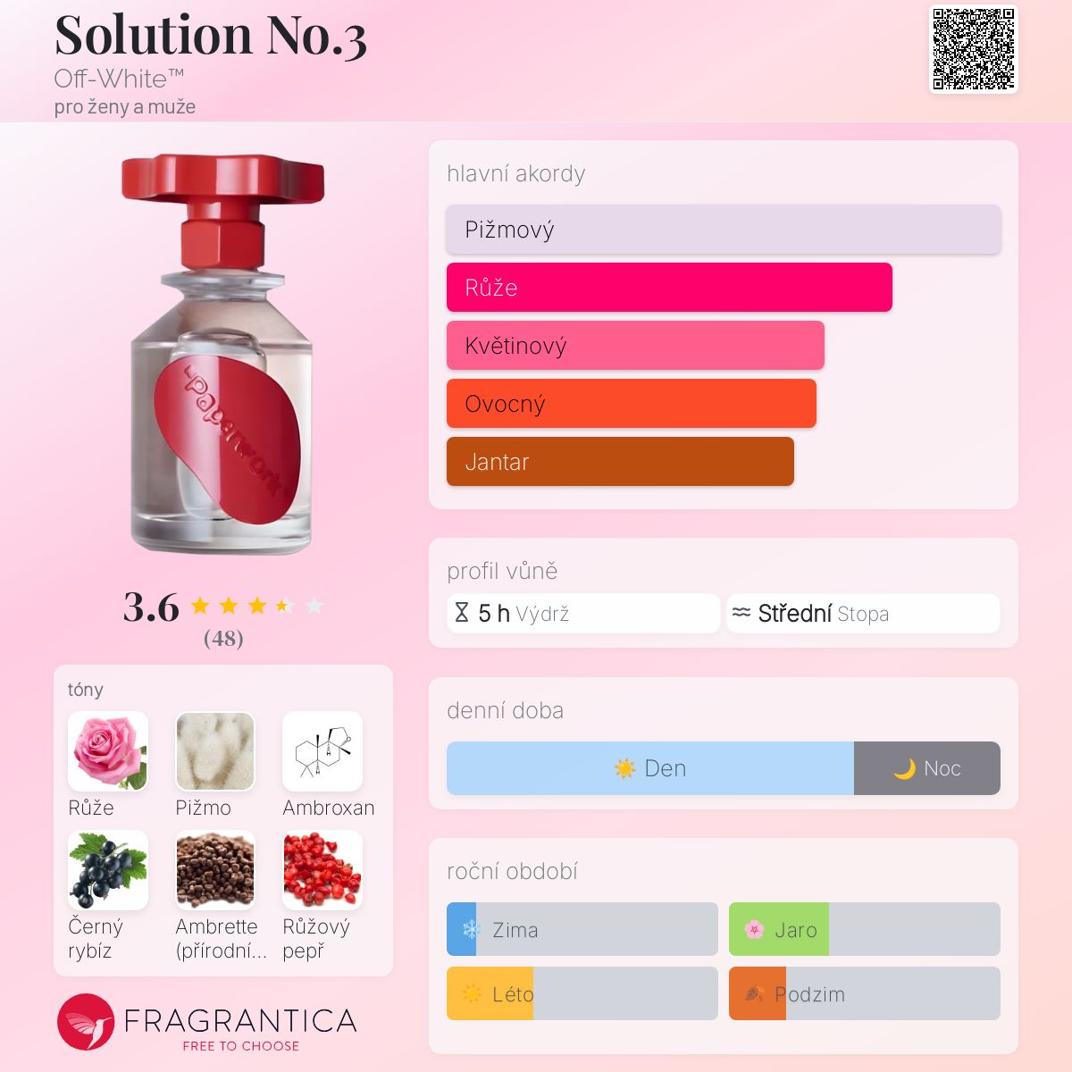 Solution No.3 podle Off-White™ je Floral vůně pro ženy a muže. Toto je nová vůně. Solution No.3 byl/a uveden/a v roce 2022. "Nosem" za touto vůní je Sidonie Lancesseur. Vrchní tóny jsou Černý rybíz, Růžový pepř a Hruška; střední tón jeDamašská růže ; základní tóny jsou Pižmo, Ambroxan a Ambrette (přírodní pižmo).