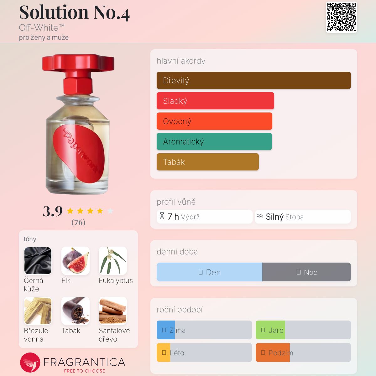 Solution No.4 podle Off-White™ je vůně pro ženy a muže. Solution No.4 byl/a uveden/a v roce 2022. "Nosem" za touto vůní je Jerome Epinette. Vrchní tóny jsou Fík, Eukalyptus, Černý čaj a Fialka; střední tóny jsouTabák, Papyrus, Vetiver, Bambus, Jalovec a Levandule ; základní tóny jsou Černá kůže, Březule vonná, Santalové dřevo a Fazole tonka.