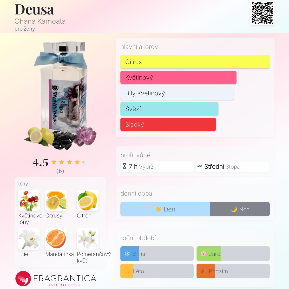 Deusa podle Ohana Kameala je Floral Fruity vůně pro ženy. Deusa byl/a uveden/a v roce 2019. "Nosem" za touto vůní je Sabrina Vieira. Vrchní tóny jsou Květiny, Citrusy, Citrón, Lilie a Mandarinka; střední tóny jsouSicilský citron, Pomerančový květ a Pivoňka ; základní tóny jsou Anýz, Pižmo, Fazole tonka a Santalové dřevo.