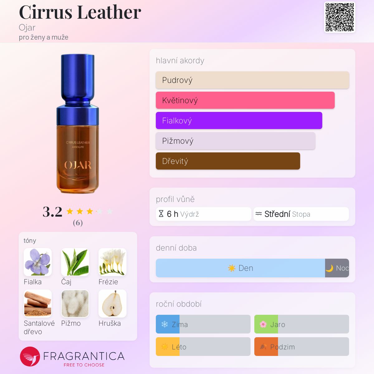 Cirrus Leather podle Ojar je Leather vůně pro ženy a muže. Cirrus Leather byl/a uveden/a v roce 2021. Vrchní tóny jsou Zelený čaj, Frézie a Hruška; střední tóny jsouFialka a Santalové dřevo ; základní tóny jsou Bílé pižmo a Ambrette (přírodní pižmo).