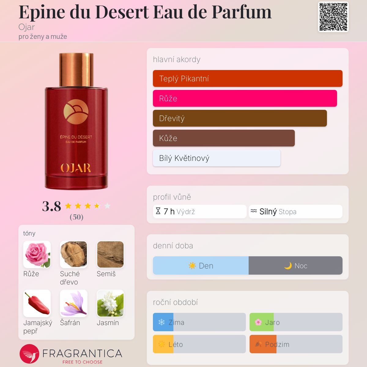 Epine du Desert Eau de Parfum podle Ojar je Orientální Floral vůně pro ženy a muže. Epine du Desert Eau de Parfum byl/a uveden/a v roce 2022. "Nosem" za touto vůní je Dalia Izem. Vrchní tóny jsou Jamajský pepř a Šafrán; střední tóny jsouRůže a Jasmín ; základní tóny jsou Suché dřevo, Semiš a Santalové dřevo.