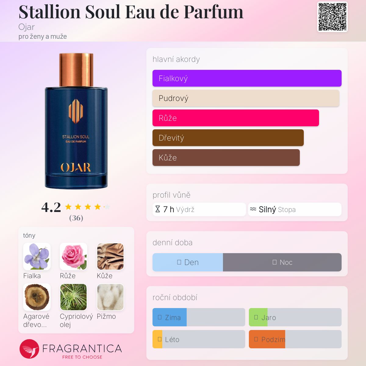 Stallion Soul Eau de Parfum podle Ojar je Leather vůně pro ženy a muže. Stallion Soul Eau de Parfum byl/a uveden/a v roce 2022. "Nosem" za touto vůní je Michel Girard. Vrchní tóny jsou Růže, Kadidlo a Růžový pepř; střední tóny jsouFialka, Kůže a Jasmín ; základní tóny jsou Agarové dřevo (oud), Cypriolový olej, Pižmo, Vanilka a Pačuli.