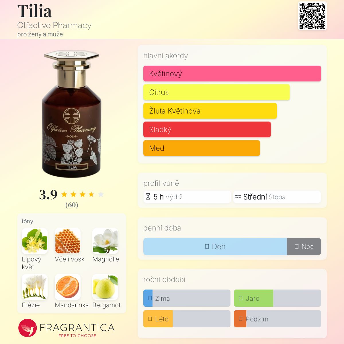 Tilia podle Olfactive Pharmacy je Floral Woody Musk vůně pro ženy a muže. Tilia byl/a uveden/a v roce 2020. "Nosem" za touto vůní je Mark Buxton. Vrchní tóny jsou Frézie, Magnólie, Mandarinka, Bergamot a Kardamom; střední tóny jsouLipový květ, Včelí vosk, Jasmín Sambac a Bulharská růže ; základní tóny jsou Pižmo, Cedr, Jantar (ambra) a Fazole tonka.