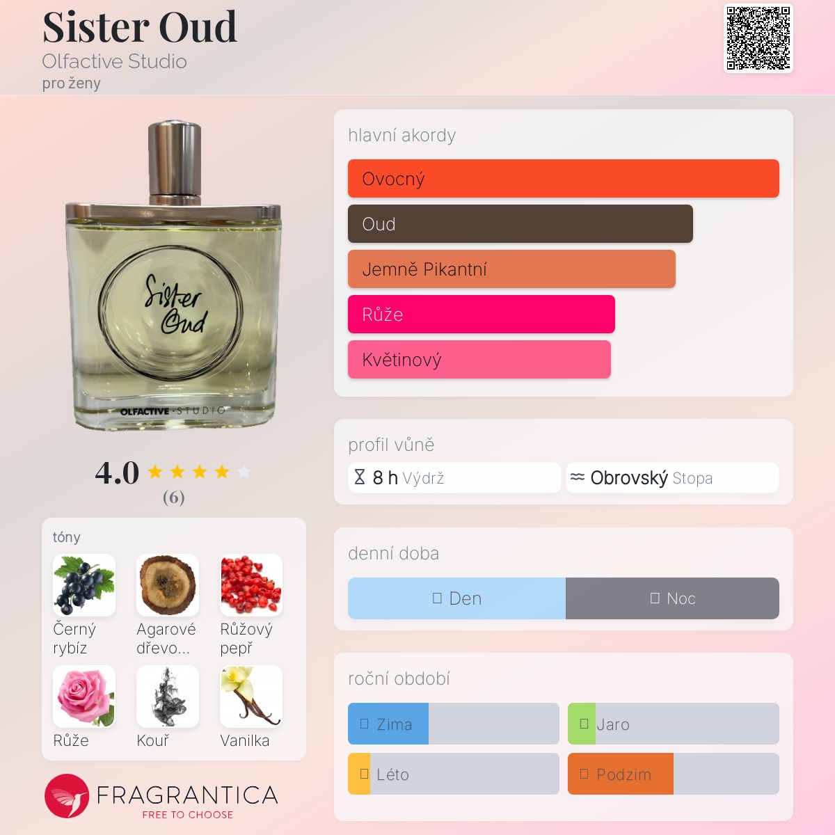 Sister Oud podle Olfactive Studio je Woody Aromatic vůně pro ženy. Toto je nová vůně. Sister Oud byl/a uveden/a v roce 2024. Vrchní tóny jsou Černý rybíz, Růžový pepř a Kardamom; střední tóny jsouAgarové dřevo (oud), Růže de Mai, Skořice a Kmín ; základní tóny jsou Kouř, Vanilka, Bílé pižmo, Santalové dřevo, Španělské labdanum, Bříza a Dubový mech.