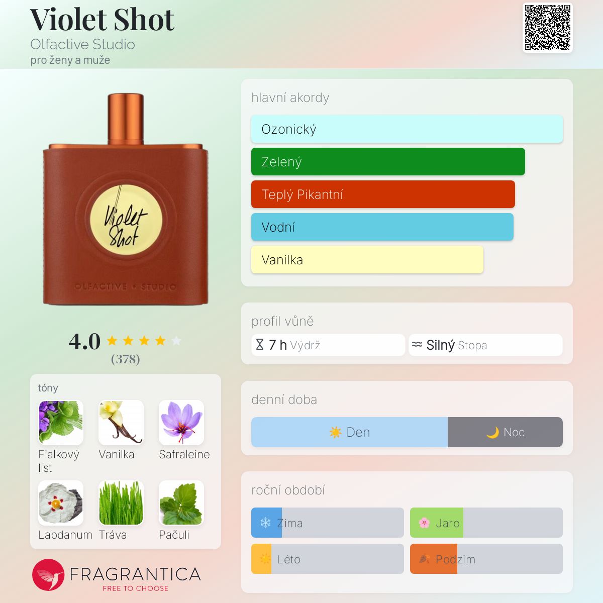Violet Shot podle Olfactive Studio je Floral vůně pro ženy a muže. Violet Shot byl/a uveden/a v roce 2019. "Nosem" za touto vůní je Dominique Ropion. Vrchní tóny jsou Zelená tráva, Italská mandarinka a Růžový pepř; střední tóny jsouFialkový list a Safraleine ; základní tóny jsou Madagaskarská vanilka, Španělské labdanum a List indonéského pačuli.