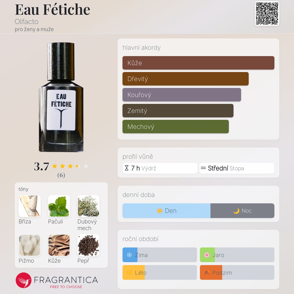 Eau Fétiche podle Olfacto je Woody Chypre vůně pro ženy a muže. Eau Fétiche byl/a uveden/a v roce 2019. Vrchní tóny jsou Bříza, Grapefruit a Citrón; střední tóny jsouPačuli, Kůže a Černý pepř ; základní tóny jsou Dubový mech, Pižmo a Jantar (ambra).