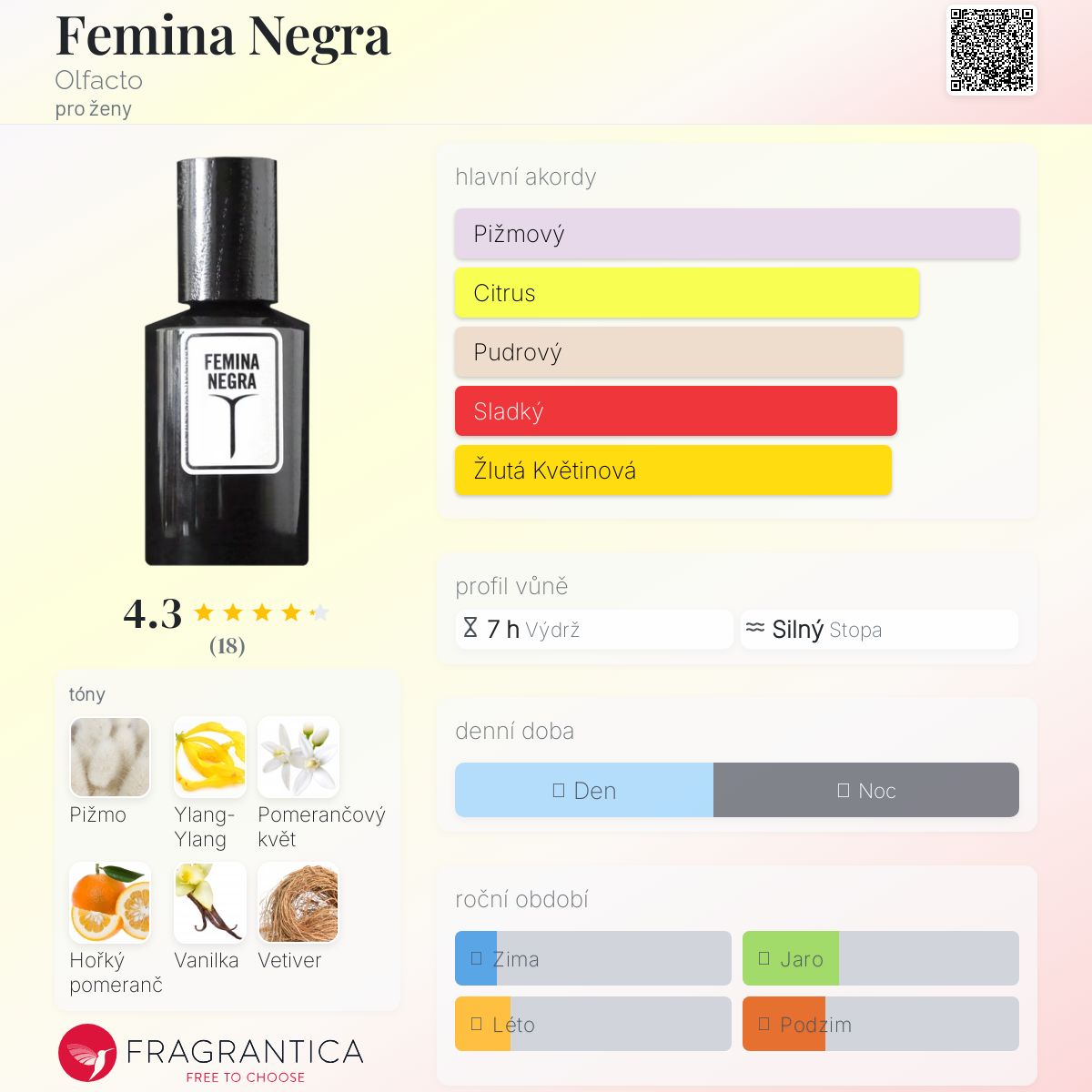 Femina Negra podle Olfacto je Floral Fruity Gourmand vůně pro ženy. Femina Negra byl/a uveden/a v roce 2019. Vrchní tóny jsou Pomerančový květ, Hořký pomeranč a Šalvěj; střední tóny jsouKašmírové pižmo, Ylang-Ylang a Jasmín ; základní tóny jsou Pižmo, Vanilka, Vetiver a Jantar (ambra).