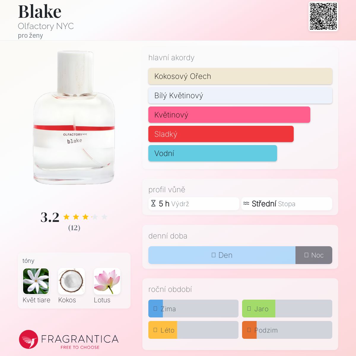 Blake podle Olfactory NYC je Floral vůně pro ženy. Blake byl/a uveden/a v roce 2017. "Nosem" za touto vůní je Ilias Ermenidis.