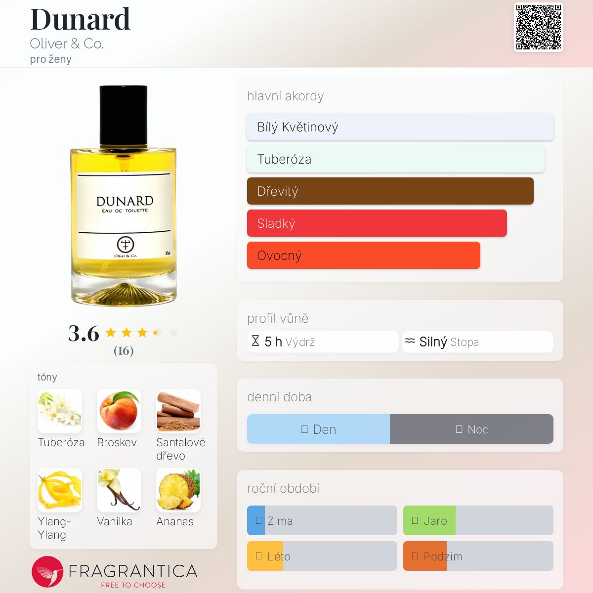 Dunard podle Oliver & Co. je Floral vůně pro ženy. Dunard byl/a uveden/a v roce 2012. "Nosem" za touto vůní je Oliver Valverde. Vrchní tóny jsou Broskev, Ananas a Grapefruit; střední tóny jsouTuberóza, Ylang-Ylang, Jasmín a Brazilské růžové dřevo ; základní tóny jsou Santalové dřevo, Vanilka a Ambretone.