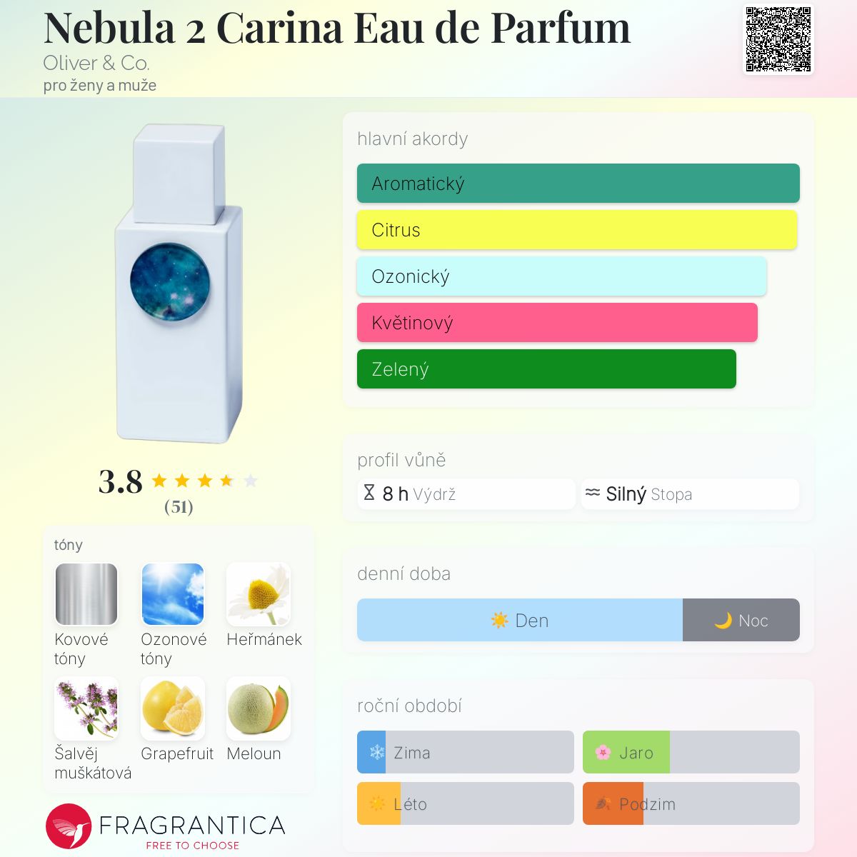 Nebula 2 Carina Eau de Parfum podle Oliver & Co. je vůně pro ženy a muže. Nebula 2 Carina Eau de Parfum byl/a uveden/a v roce 2017. "Nosem" za touto vůní je Oliver Valverde.