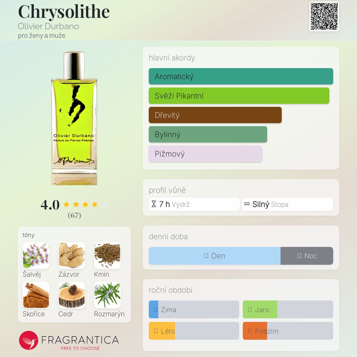 Chrysolithe podle Olivier Durbano je Woody Aromatic vůně pro ženy a muže. Chrysolithe byl/a uveden/a v roce 2015. Vrchní tóny jsou Zázvor, Kmín, Skořice a Černý pepř; střední tóny jsouŠalvěj, Rozmarýn a Jasmín ; základní tóny jsou Šalvěj, Cedr, Pižmo, Vetiver a Ambra.
