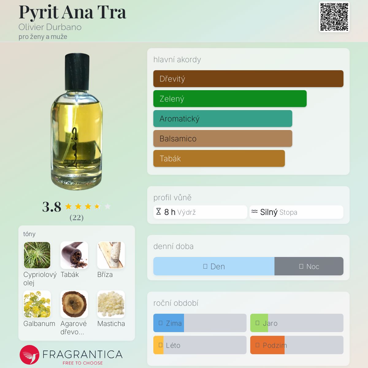 Pyrit Ana Tra podle Olivier Durbano je Woody Floral Musk vůně pro ženy a muže. Pyrit Ana Tra byl/a uveden/a v roce 2018. "Nosem" za touto vůní je Olivier Durbano. Vrchní tóny jsou Neroli, Lékořice, Petitgrain a Kmín; střední tóny jsouCypriolový olej, Bříza, Galbanum, Agarové dřevo (oud), Masticha a Pistácie ; základní tóny jsou Tabák, Ambra a Pižmo.