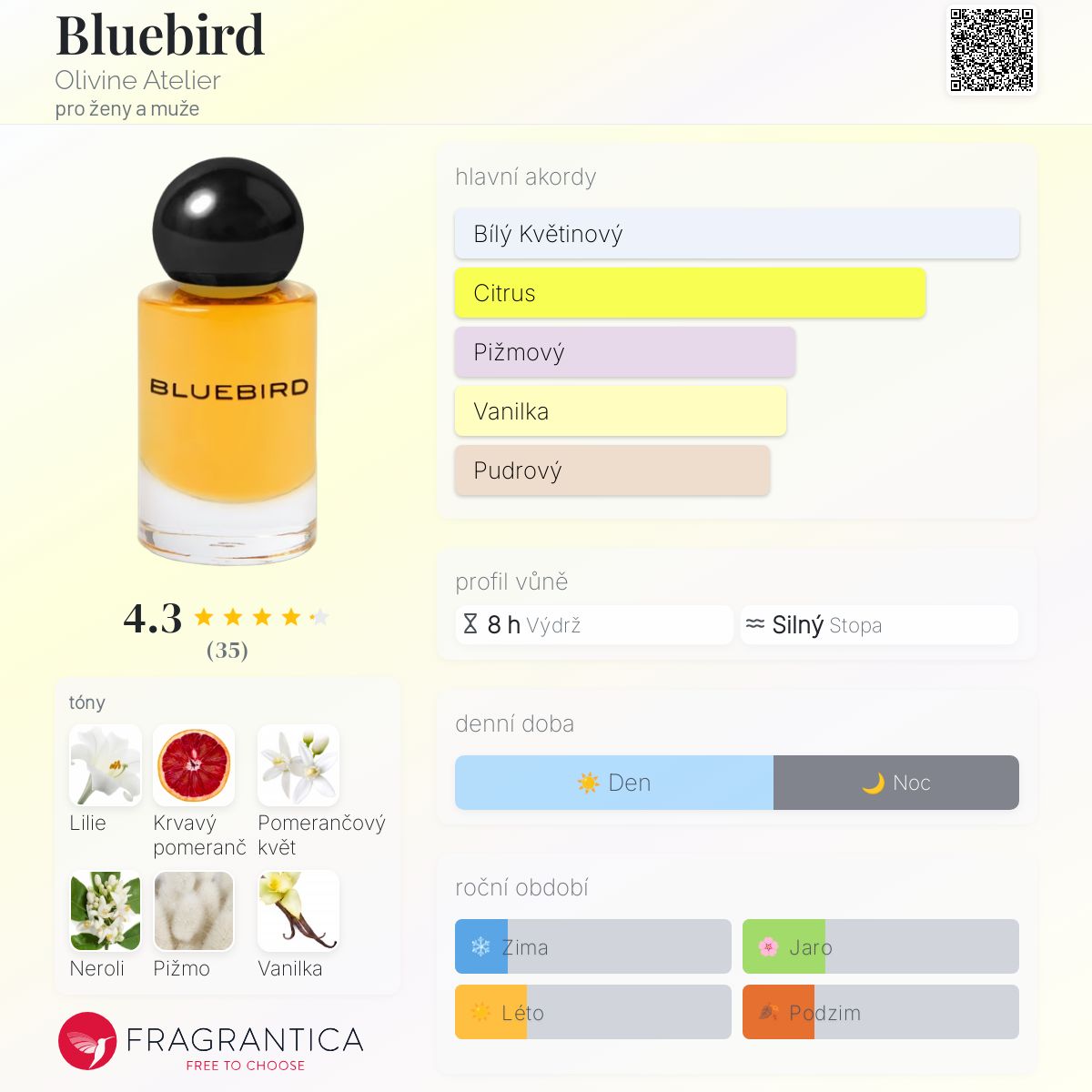 Bluebird podle Olivine Atelier je Floral vůně pro ženy a muže. Bluebird byl/a uveden/a v roce 2015. Vrchní tóny jsou Krvavý pomeranč a Neroli; střední tóny jsouLilie a Pomerančový květ ; základní tóny jsou Pižmo a Vanilka.