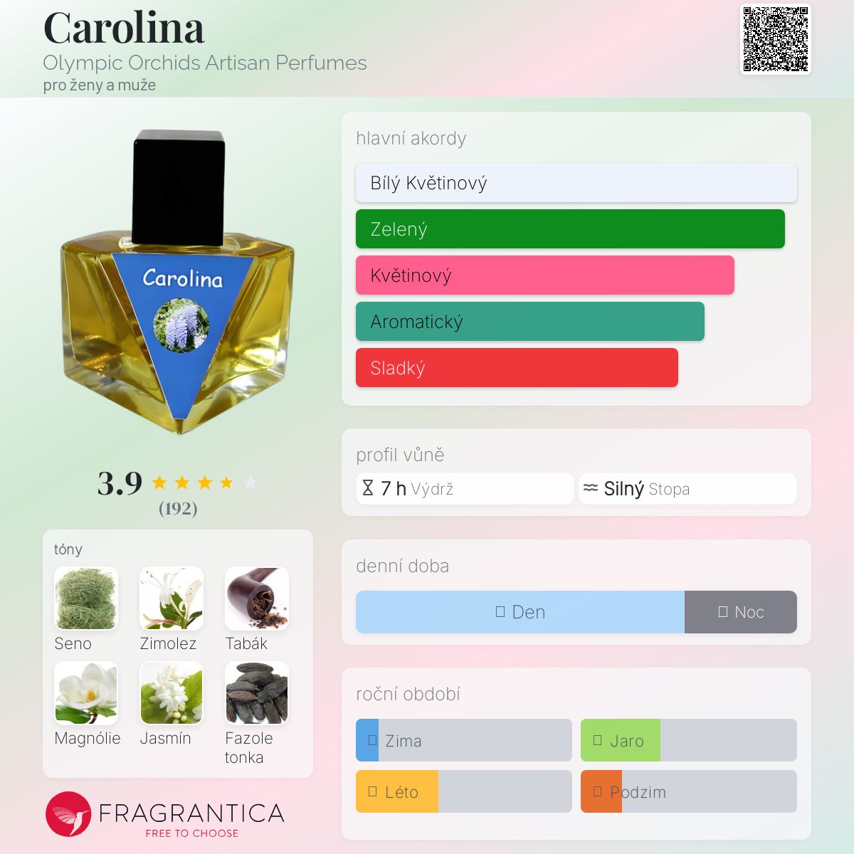 Carolina podle Olympic Orchids Artisan Perfumes je Aromatic vůně pro ženy a muže. Carolina byl/a uveden/a v roce 2010. "Nosem" za touto vůní je Ellen Covey.