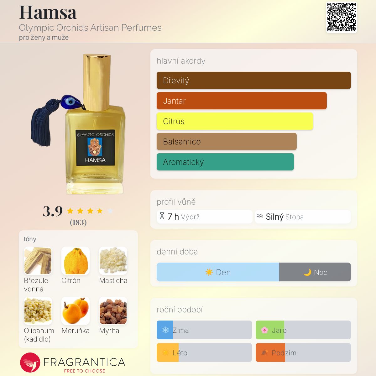 Hamsa podle Olympic Orchids Artisan Perfumes je Orientální vůně pro ženy a muže. Hamsa byl/a uveden/a v roce 2017. "Nosem" za touto vůní je Ellen Covey.