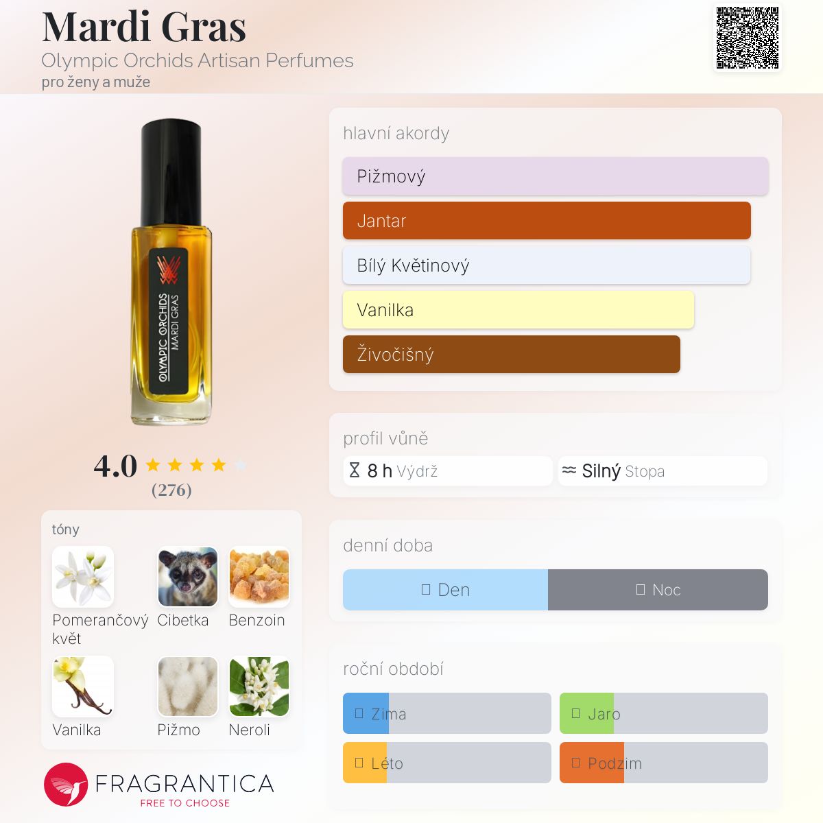 Mardi Gras podle Olympic Orchids Artisan Perfumes je Orientální Floral vůně pro ženy a muže. Mardi Gras byl/a uveden/a v roce 2015. "Nosem" za touto vůní je Ellen Covey.