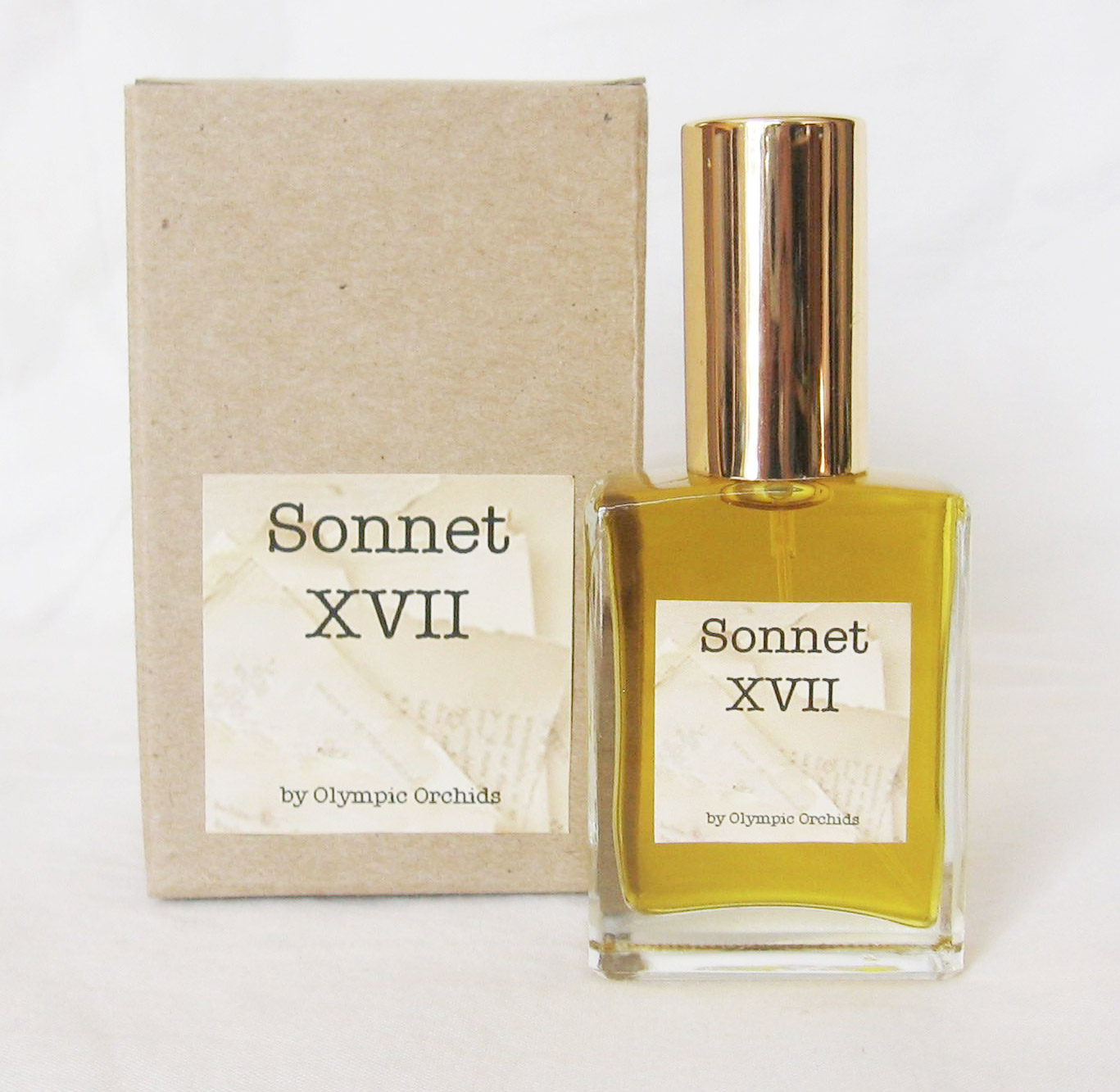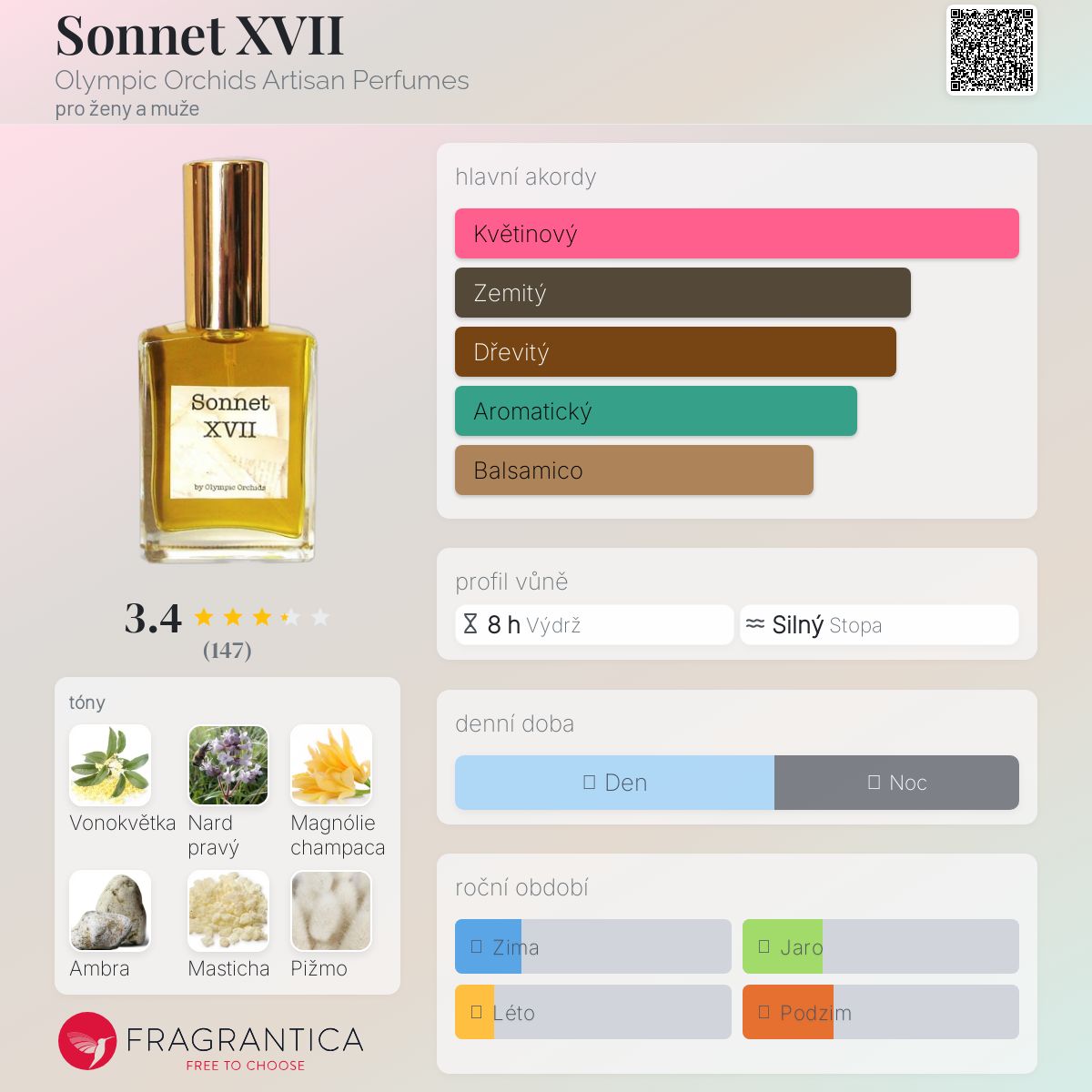 Sonnet XVII podle Olympic Orchids Artisan Perfumes je Floral Woody Musk vůně pro ženy a muže. Sonnet XVII byl/a uveden/a v roce 2012. "Nosem" za touto vůní je Ellen Covey. Vrchní tóny jsou Magnólie champaca, Masticha, Pepřovník kubebový a Citrón; střední tóny jsouVonokvětka a Orchidej ; základní tóny jsou Nard himálajský, Ambra, Pižmo, Dubový mech, Dřevité tóny, Haitský vetiver a Bourbonská vanilka.