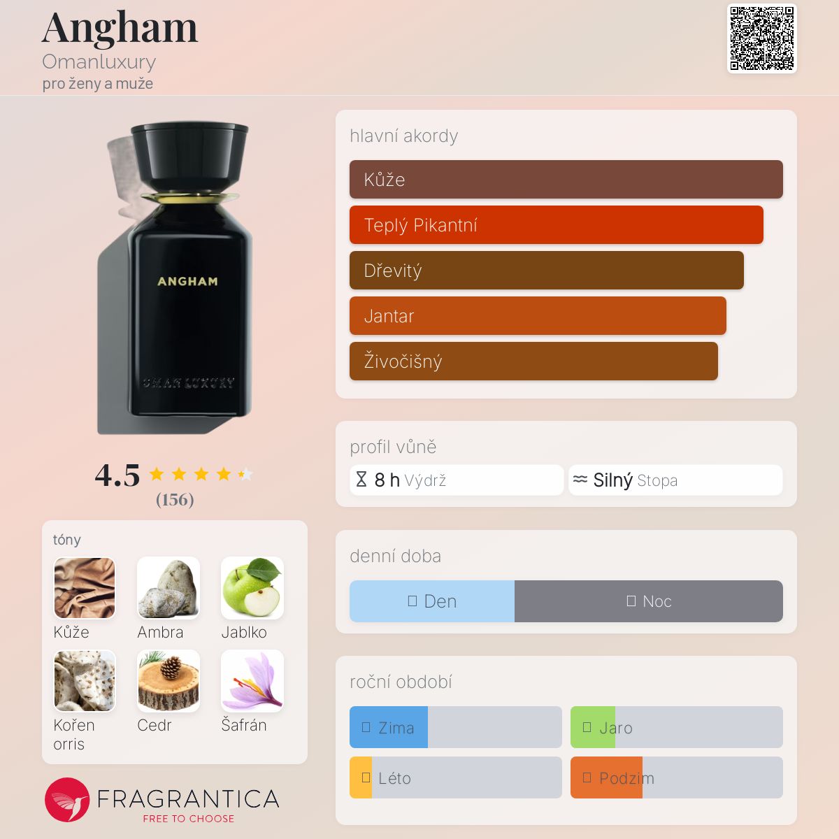 Angham podle Omanluxury je vůně pro ženy a muže. Angham byl/a uveden/a v roce 2020. "Nosem" za touto vůní je Emilie Coppermann. Vrchní tóny jsou Jablko, Šafrán, Citrusy a Hřebíček; střední tóny jsouKořen orris, Jasmín a Pelargónie ; základní tóny jsou Kůže, Ambra, Cedr, Santalové dřevo, Benzoin a Vanilka.