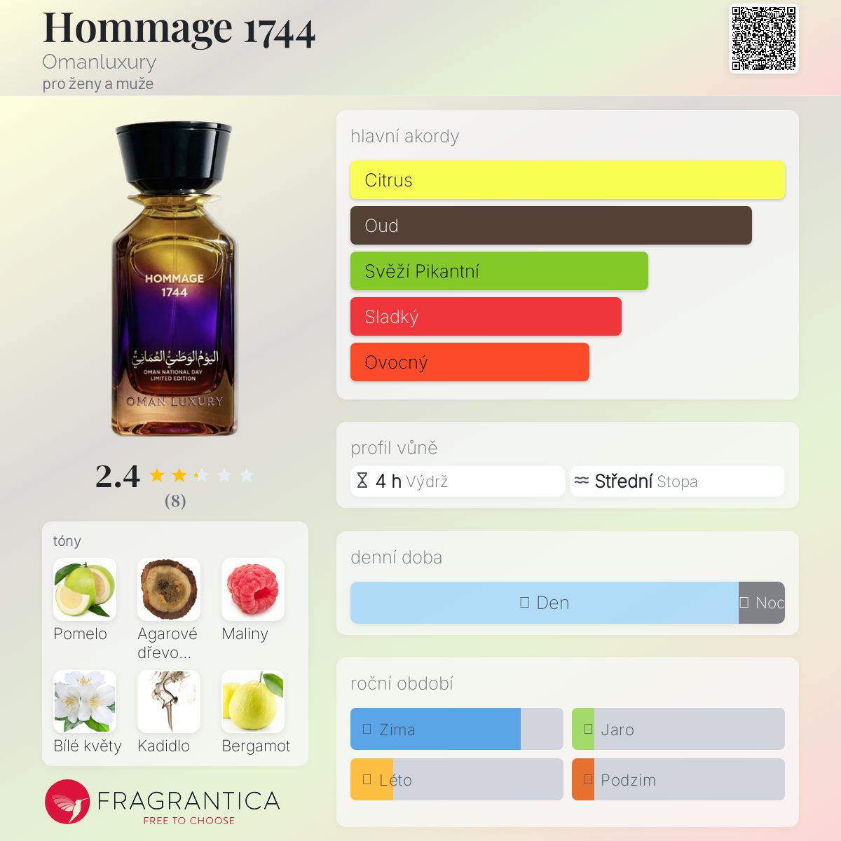 Hommage 1744 podle Omanluxury je Orientální Woody vůně pro ženy a muže. Toto je nová vůně. Hommage 1744 byl/a uveden/a v roce 2025. "Nosem" za touto vůní je Théo Belmas. Vrchní tóny jsou Pomelo, Maliny, Bergamot a Citrón; střední tóny jsouAgarové dřevo (oud), Bílé květy a Ambroxan ; základní tóny jsou Kadidlo, Kašmír, Jantar (ambra) a Pačuli.
