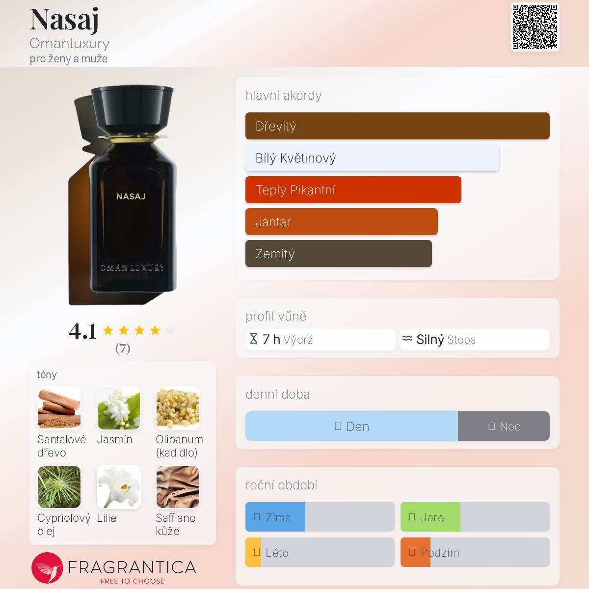 Nasaj podle Omanluxury je Orientální Floral vůně pro ženy a muže. Toto je nová vůně. Nasaj byl/a uveden/a v roce 2025. "Nosem" za touto vůní je Meabh McCurtin. Vrchní tóny jsou Mandarinka, Hruška, Grapefruit, Mandarinka, Kardamom a Růžový pepř; střední tóny jsouJasmín, Lilie, Gardénie, Tuberóza, Magnólie a Neroli ; základní tóny jsou Santalové dřevo, Kadidlo, Cypriolový olej, Saffiano kůže, Pačuli a Fazole tonka.