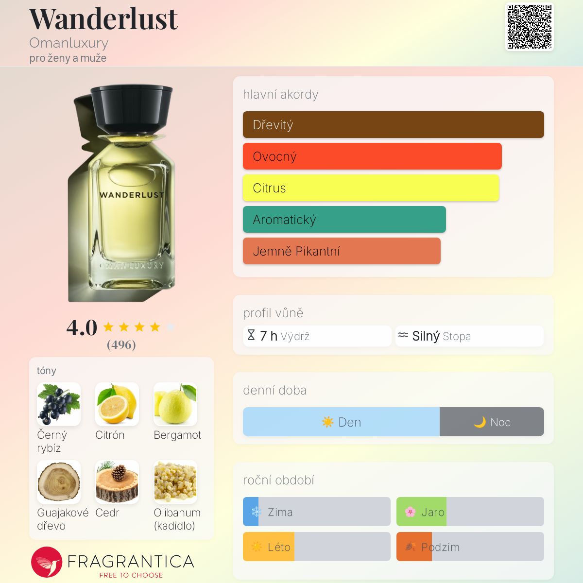 Wanderlust podle Omanluxury je Floral Green vůně pro ženy a muže. Wanderlust byl/a uveden/a v roce 2020. "Nosem" za touto vůní je Jean-Louis Sieuzac. Vrchní tóny jsou Citrón, Bergamot a Růžový pepř; střední tóny jsouČerný rybíz, Skořice a Šafrán ; základní tóny jsou Guajakové dřevo, Cedr a Olibanum.