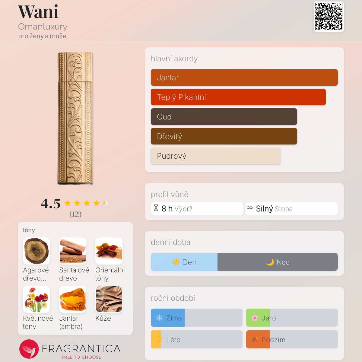 Wani podle Omanluxury je Floral Woody Musk vůně pro ženy a muže. Wani byl/a uveden/a v roce 2021. Wani byl/a vytvořen/a Alienor Massenet a Muatasim Al Hinai.