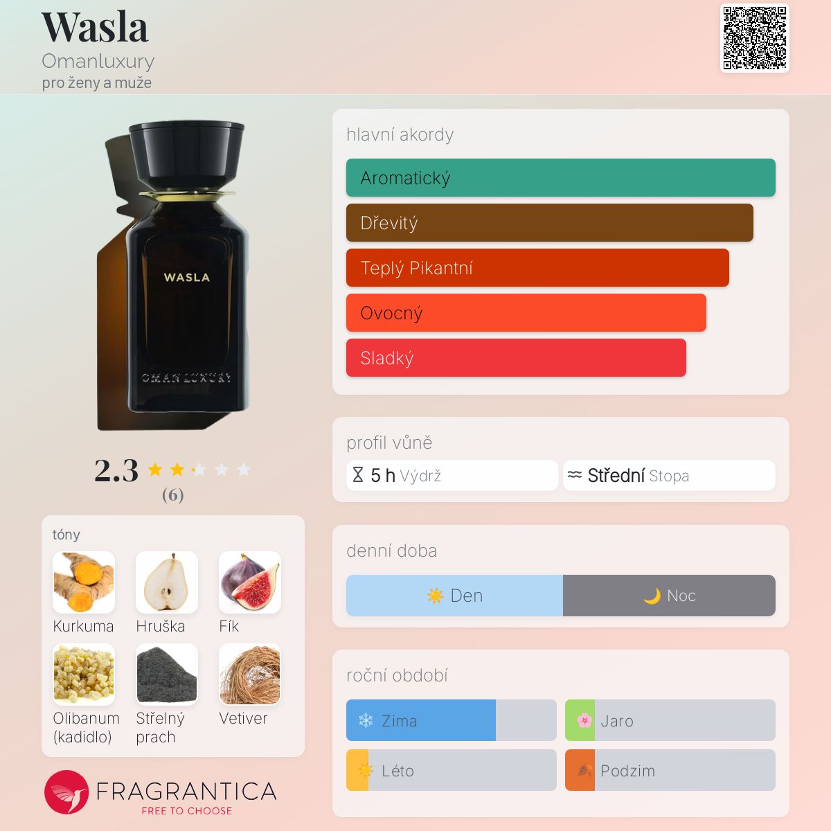 Wasla podle Omanluxury je Orientální Spicy vůně pro ženy a muže. Toto je nová vůně. Wasla byl/a uveden/a v roce 2025. "Nosem" za touto vůní je Carole Calmettes. Vrchní tóny jsou Kurkuma, Hruška, Fík, Černý pepř, Růžový pepř, Jalovec a Citrón; střední tóny jsouKadidlo, Střelný prach a Šalvěj muškátová ; základní tóny jsou Vetiver, Fazole tonka, Guajakové dřevo, Pačuli a Pižmo.