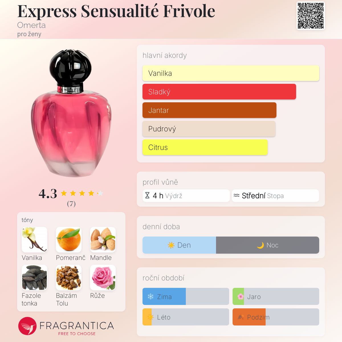 Express Sensualité Frivole podle Omerta je Orientální vůně pro ženy. Express Sensualité Frivole byl/a uveden/a v roce 2018. Vrchní tón je Pomeranč ; střední tóny jsouDamašská růže a Travní růže ; základní tóny jsou Vanilka, Mandle, Fazole tonka, Balzám Tolu a Santalové dřevo.