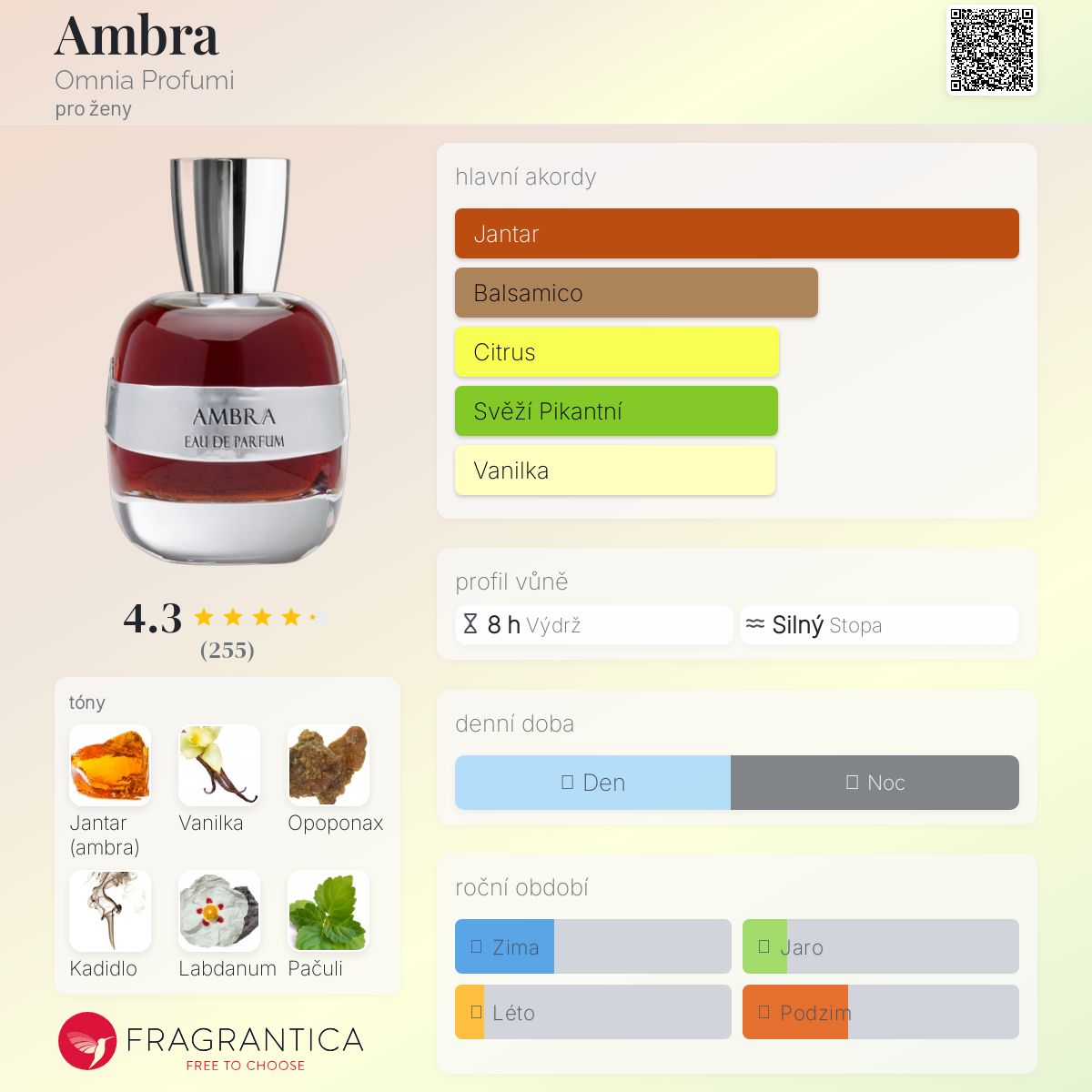 Ambra podle Omnia Profumi je Orientální vůně pro ženy. Ambra byl/a uveden/a v roce 2004. "Nosem" za touto vůní je Fabrizio Tagliacarne. Vrchní tóny jsou Pomeranč, Pelargónie a Bergamot; střední tóny jsouKadidlo, Pačuli a Levandule ; základní tóny jsou Jantar (ambra), Vanilka, Opoponax a Labdanum.
