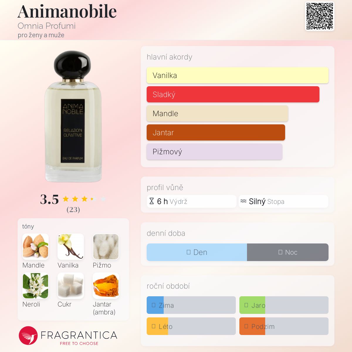 Animanobile podle Omnia Profumi je vůně pro ženy a muže. Animanobile byl/a uveden/a v roce 2019. "Nosem" za touto vůní je Fabrizio Tagliacarne. Vrchní tóny jsou Mandle, Vanilka a Cukr; střední tóny jsouHořká mandle, Mandlové mléko a Neroli ; základní tóny jsou Pižmo, Vanilkový lusk, Jantar (ambra) a Fazole tonka.
