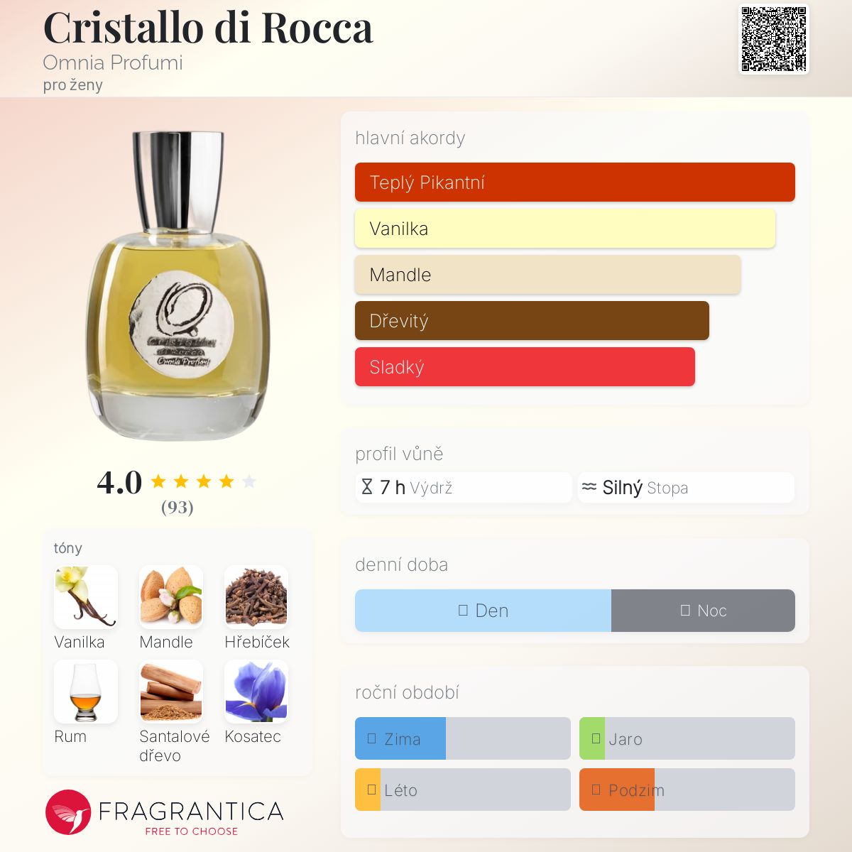 Cristallo di Rocca podle Omnia Profumi je Floral Woody Musk vůně pro ženy. Cristallo di Rocca byl/a uveden/a v roce 2013. "Nosem" za touto vůní je Fabrizio Tagliacarne. Vrchní tóny jsou Ylang-Ylang, Pelargónie, Citrusy, Konvalinka a Růže; střední tóny jsouMandle, Hřebíček, Rum a Kosatec ; základní tóny jsou Vanilka a Santalové dřevo.