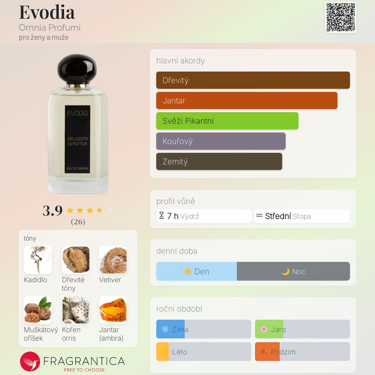 Evodia podle Omnia Profumi je Woody Spicy vůně pro ženy a muže. Evodia byl/a uveden/a v roce 2019. "Nosem" za touto vůní je Fabrizio Tagliacarne. Vrchní tóny jsou Muškátový oříšek a Černý pepř; střední tóny jsouKadidlo a Orris ; základní tóny jsou Dřevité tóny, Vetiver, Jantar (ambra) a Fazole tonka.