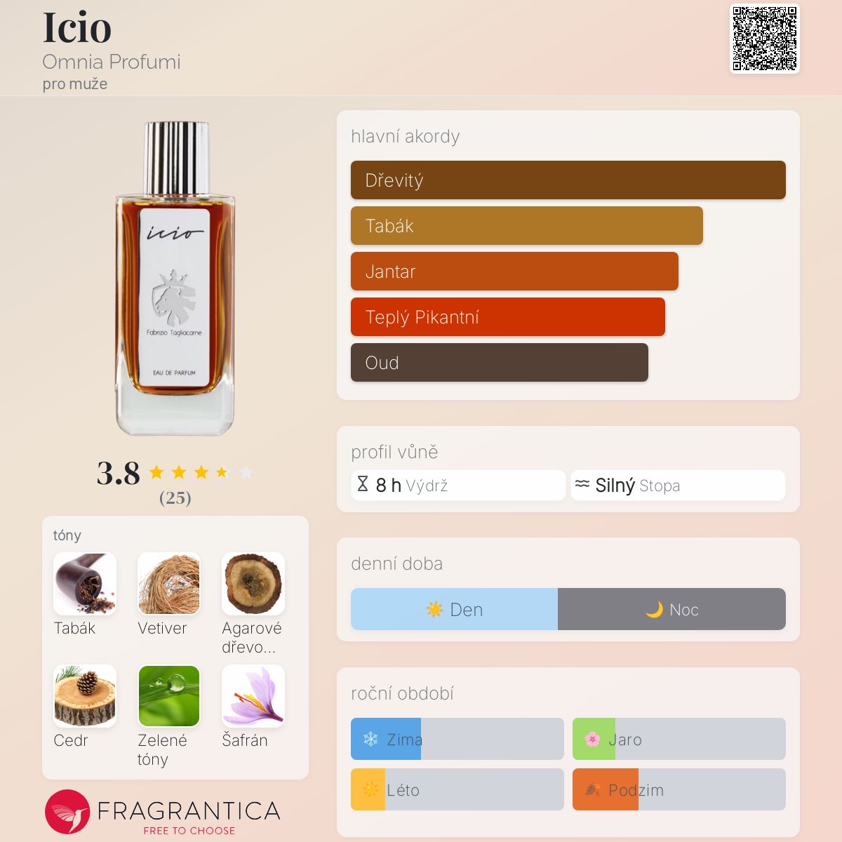 Icio podle Omnia Profumi je Woody Spicy vůně pro muže. Icio byl/a uveden/a v roce 2019. "Nosem" za touto vůní je Fabrizio Tagliacarne. Vrchní tóny jsou Tabák a Zelený tón; střední tóny jsouCedr, Šafrán, Labdanum a Pačuli ; základní tóny jsou Vetiver, Agarové dřevo (oud) a Kadidlo.