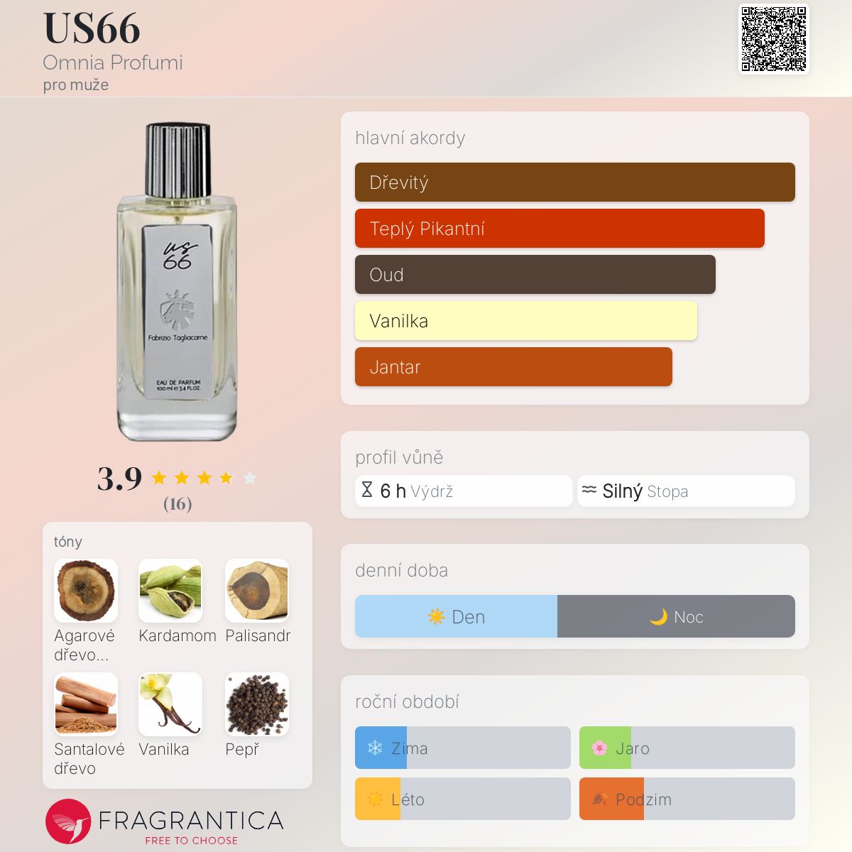 US66 podle Omnia Profumi je Orientální Spicy vůně pro muže. US66 byl/a uveden/a v roce 2020. "Nosem" za touto vůní je Fabrizio Tagliacarne. Vrchní tóny jsou Kardamom a Černý pepř; střední tóny jsouPalisandr a Fazole tonka ; základní tóny jsou Agarové dřevo (oud), Santalové dřevo, Vanilka, Vetiver a Jantar (ambra).