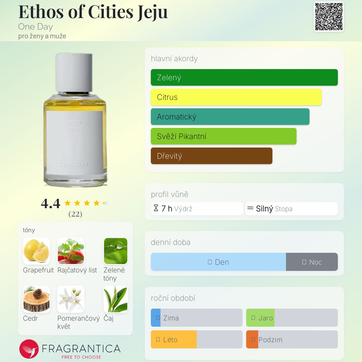 Ethos of Cities Jeju podle One Day je Citrus Aromatic vůně pro ženy a muže. Toto je nová vůně. Ethos of Cities Jeju byl/a uveden/a v roce 2024. Vrchní tóny jsou Grapefruit a Zelený čaj; střední tóny jsouRajčatový list, Zelené tóny a Pomerančový květ ; základní tóny jsou Cedr, Pižmo a Mech.