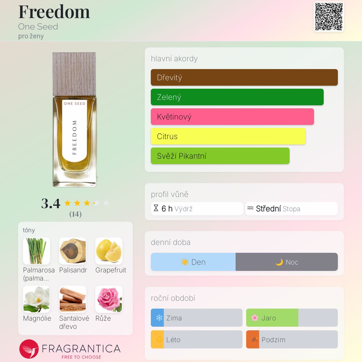 Freedom podle One Seed je Floral Green vůně pro ženy. Freedom byl/a uveden/a v roce 2009. "Nosem" za touto vůní je Liz Cook. Vrchní tóny jsou Palmarosa (palma růžová), Palisandr a Růžový grapefruit; střední tóny jsouMagnólie, Bulharská růže, Černý pepř a Gardénie ; základní tóny jsou Santalové dřevo, Pižmo, Ambrette (přírodní pižmo) a Benzoin.
