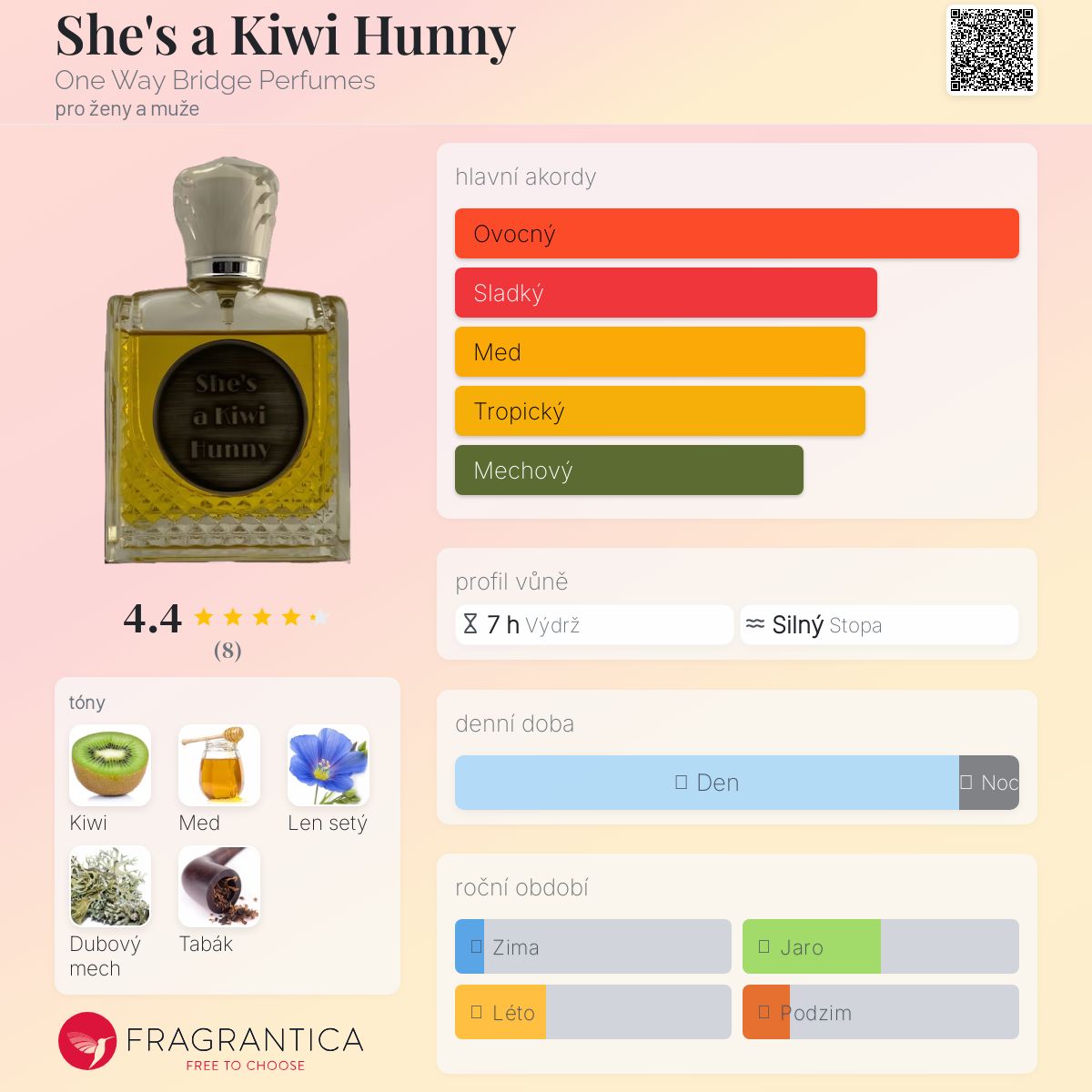 She's a Kiwi Hunny podle One Way Bridge Perfumes je Floral vůně pro ženy a muže. She's a Kiwi Hunny byl/a uveden/a v roce 2020. "Nosem" za touto vůní je Elise Walraven.
