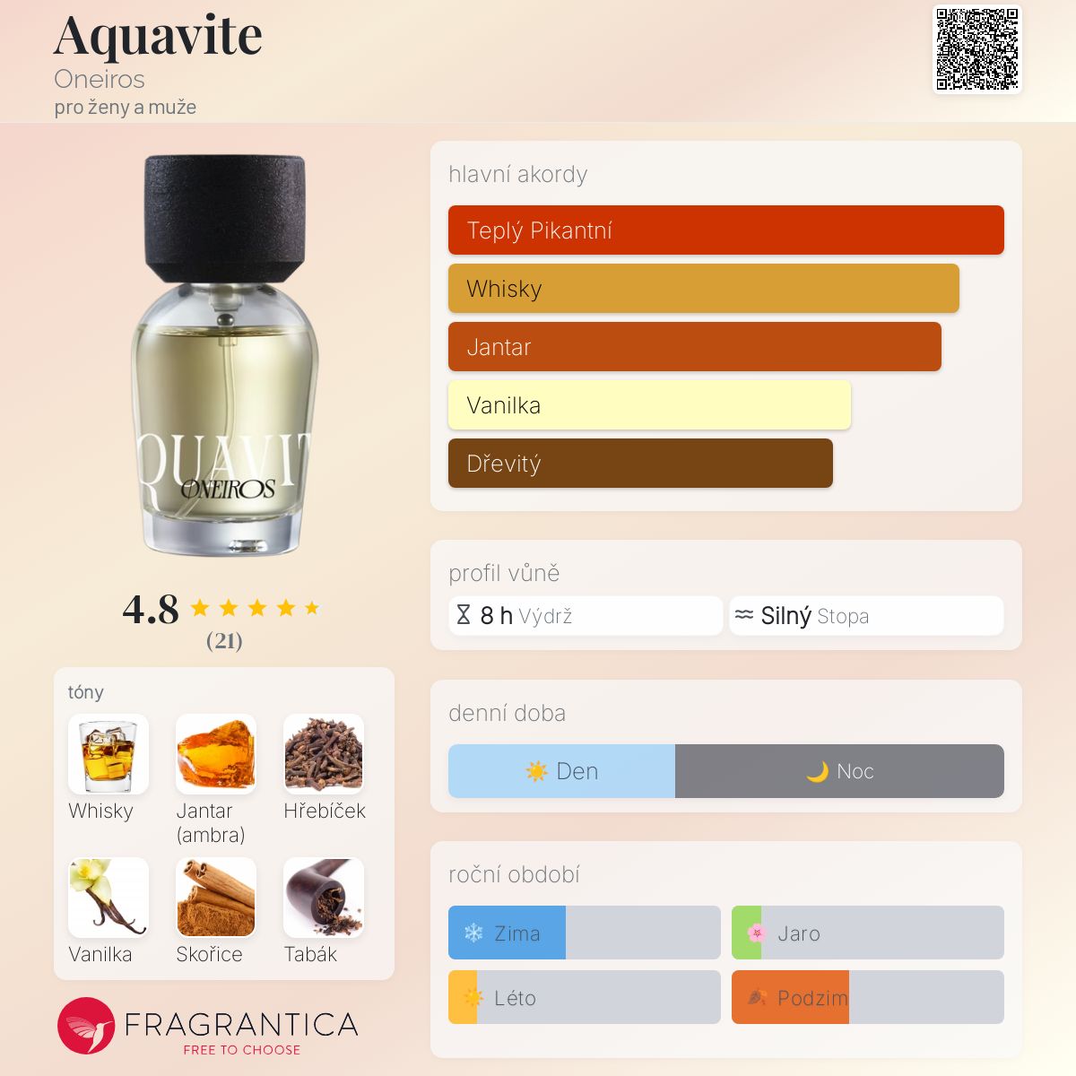 Aquavite podle Oneiros je vůně pro ženy a muže. Toto je nová vůně. Aquavite byl/a uveden/a v roce 2025. "Nosem" za touto vůní je Anh Ngo. Vrchní tóny jsou Whisky, Grapefruit a Třešeň; střední tóny jsouHřebíček, Skořice, Tabák a Kadidlo ; základní tóny jsou Jantar (ambra), Vanilka a Pižmo.