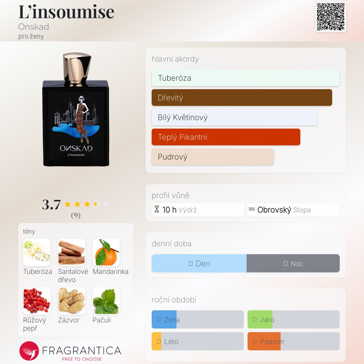 L’insoumise podle Onskad je Floral vůně pro ženy. L’insoumise byl/a uveden/a v roce 2023. "Nosem" za touto vůní je Lea Hiram. Vrchní tóny jsou Žlutá mandarinka, Růžový pepř a Zázvor; střední tóny jsouTuberóza, Vonokvětka a Galbanum ; základní tóny jsou Santalové dřevo, Pačuli, Benzoin a Kůže.
