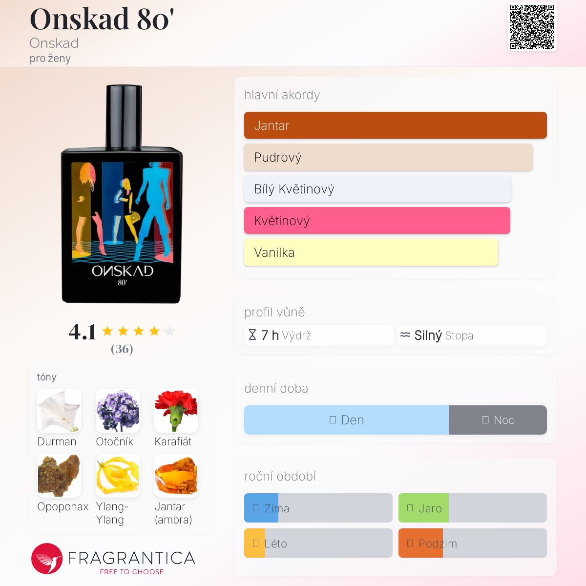 Onskad 80' podle Onskad je Orientální Floral vůně pro ženy. Onskad 80' byl/a uveden/a v roce 2021. "Nosem" za touto vůní je Lea Hiram. Vrchní tóny jsou Citrón a Mandarinka; střední tóny jsouDurman, Karafiát, Ylang-Ylang a Jantar (ambra) ; základní tóny jsou Otočník, Opoponax, Pižmo a Vanilka.