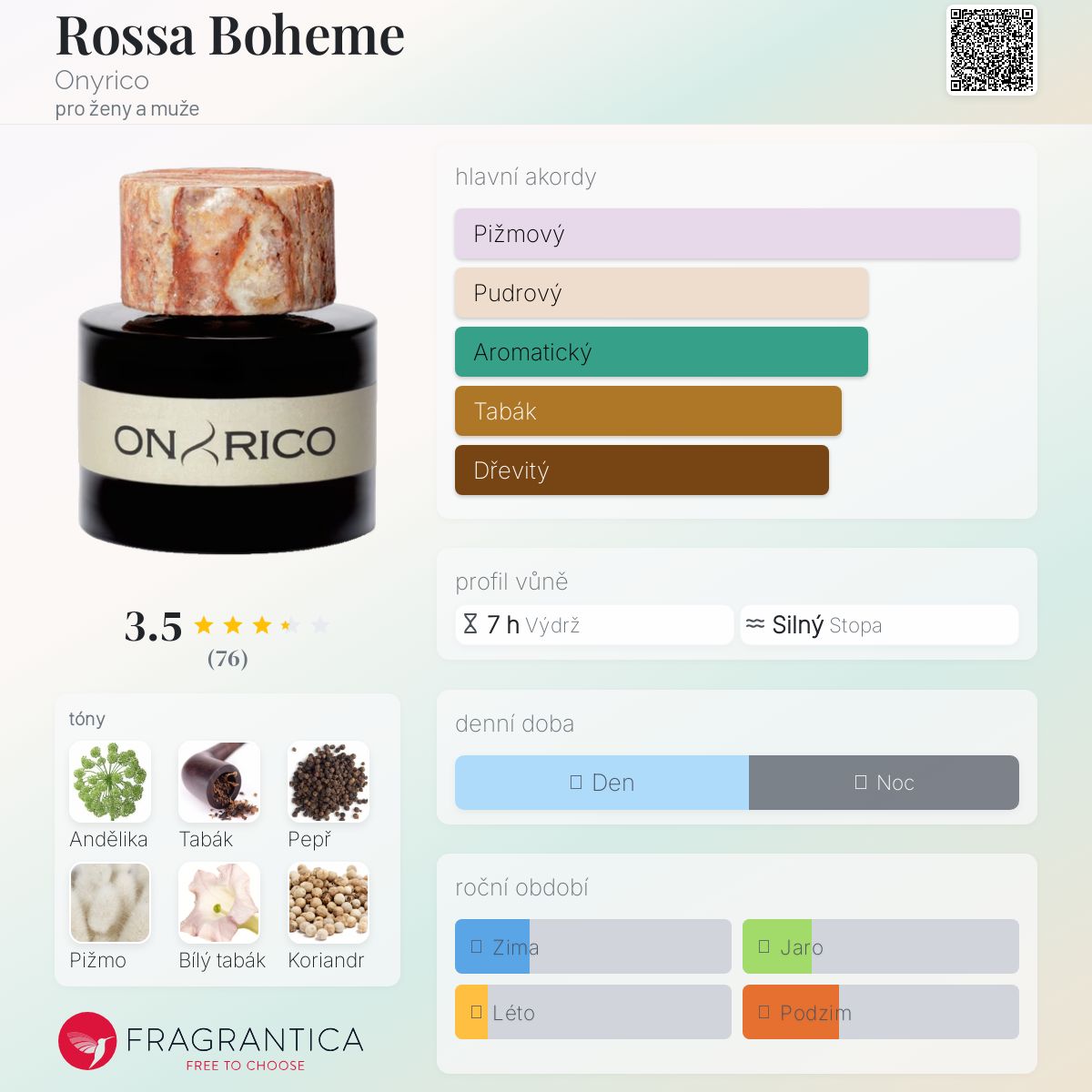 Rossa Boheme podle Onyrico je Orientální Spicy vůně pro ženy a muže. Rossa Boheme byl/a uveden/a v roce 2015. "Nosem" za touto vůní je Luca Maffei. Vrchní tóny jsou Andělika, Koriandr, Růžový pepř a Citrón; střední tóny jsouTabák, Černý pepř, Bílý tabák a Skořice ; základní tóny jsou Pižmo, Vetiver, Cedr, Pačuli a Jantar (ambra).