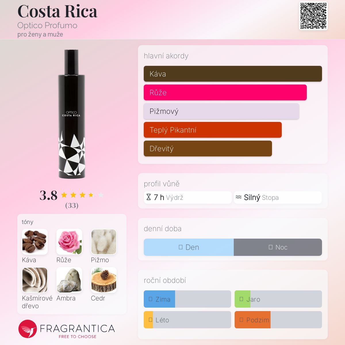 Costa Rica podle Optico Profumo je Woody Floral Musk vůně pro ženy a muže. Costa Rica byl/a uveden/a v roce 2016. "Nosem" za touto vůní je Nicola Bianchi. Vrchní tóny jsou Růže a Pelargónie; střední tóny jsouKáva, Kašmírové dřevo, Cedr a Agarové dřevo (oud) ; základní tóny jsou Pižmo a Ambra.