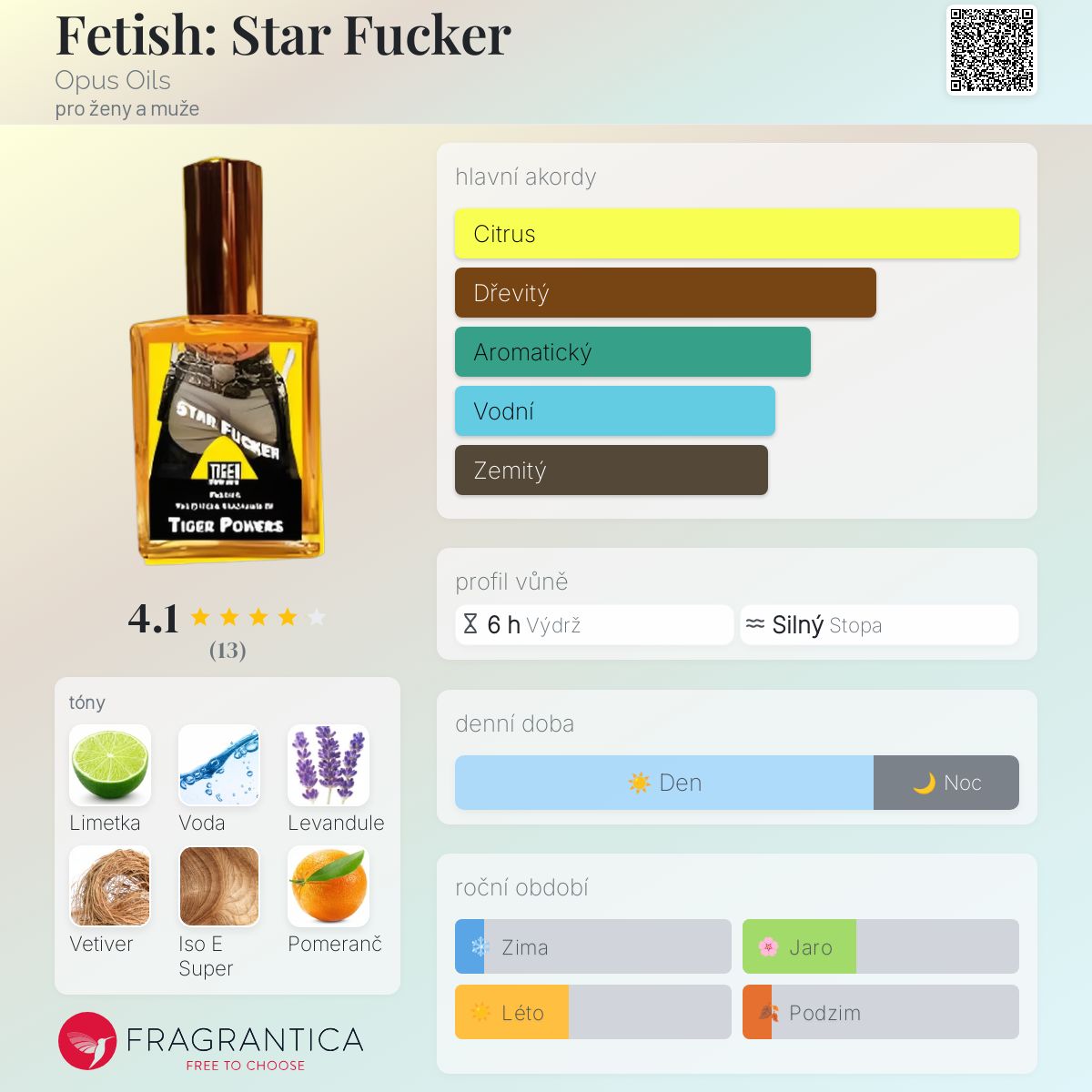 Fetish: Star Fucker podle Opus Oils je Aromatic Aquatic vůně pro ženy a muže. Fetish: Star Fucker byl/a uveden/a v roce 2012. Vrchní tóny jsou Limetka, Divoký pomeranč, Italský citrón, Zelená mandarinka a Bergamot; střední tóny jsouVodnaté tóny, Levandule, Iso E Super, Jasmín a Pomerančový květ ; základní tóny jsou Vetiver, Dubový mech, Agarové dřevo (oud), Santalové dřevo a Jantar (ambra).