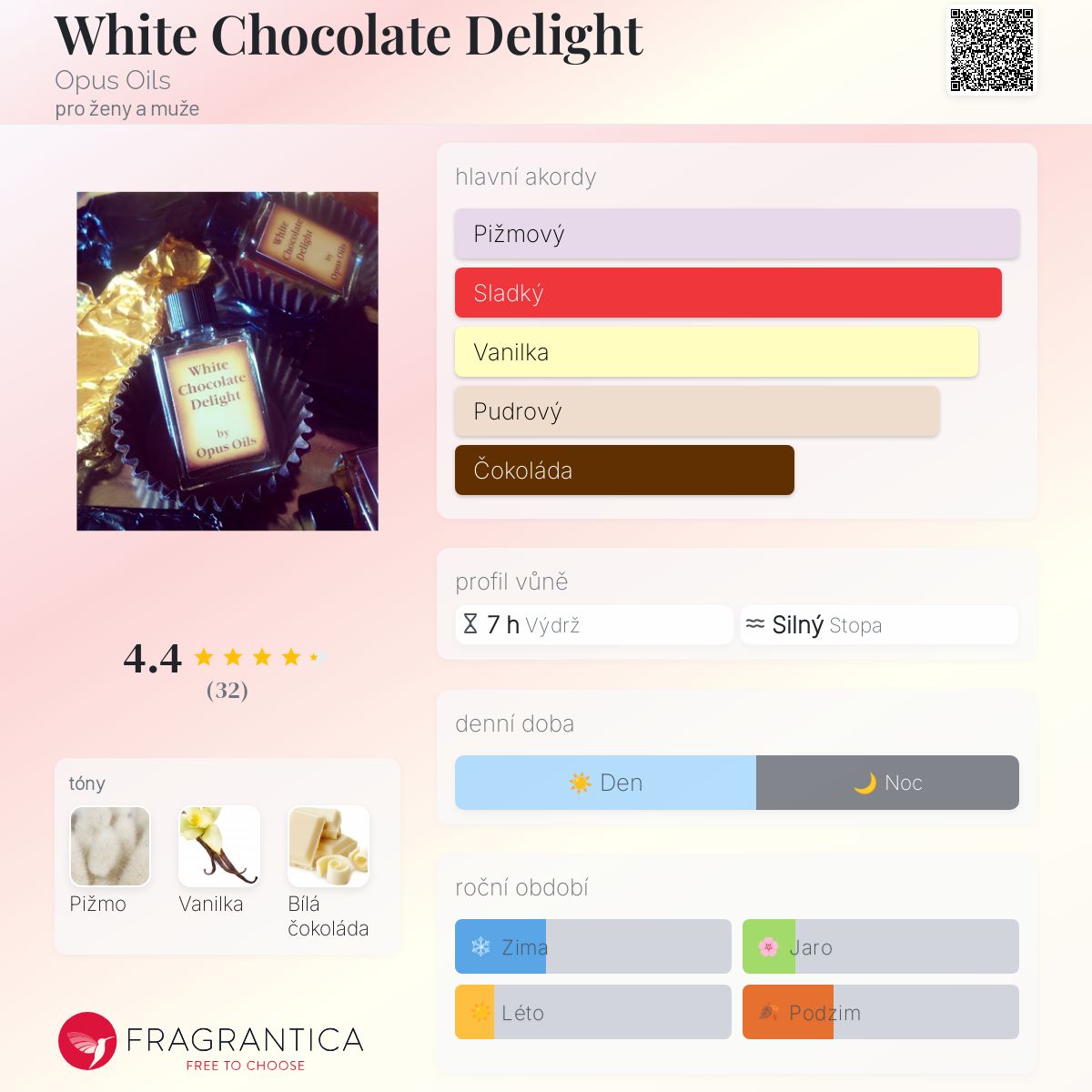 White Chocolate Delight podle Opus Oils je Orientální Vanilla vůně pro ženy a muže. White Chocolate Delight byl/a uveden/a v roce 2014. "Nosem" za touto vůní je Kedra Hart.