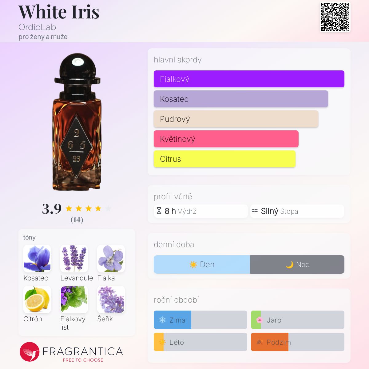 White Iris podle OrdioLab je vůně pro ženy a muže. Toto je nová vůně. White Iris byl/a uveden/a v roce 2024. "Nosem" za touto vůní je Jerry Lin. Vrchní tóny jsou Kosatec, Levandule, Fialka, Fialkový list, Šeřík a Estragon; střední tóny jsouCitrón, Pačuli, Kastoreum, Labdanum a Chyprové tóny ; základní tóny jsou Pačuli, Kadidlo, Černý jantar, Cedr, Jantar (ambra) a Pižmo.