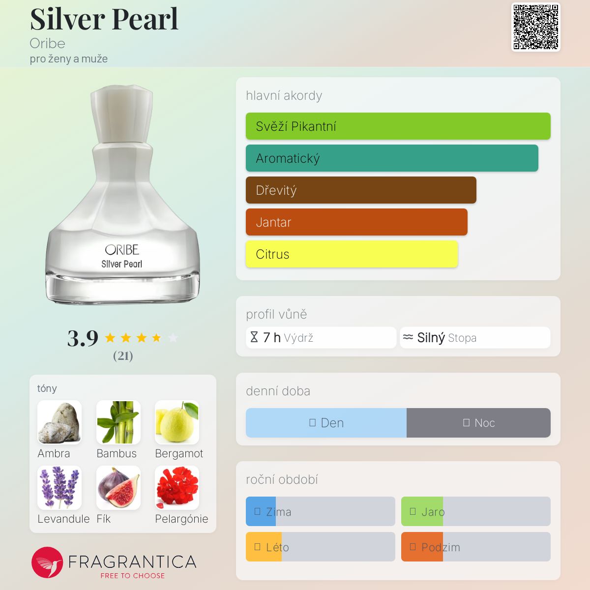 Silver Pearl podle Oribe je Aromatic Fougere vůně pro ženy a muže. Silver Pearl byl/a uveden/a v roce 2014. Silver Pearl byl/a vytvořen/a Jérôme Epinette a Pierre Wulff. Vrchní tóny jsou Bergamot, Fík a Máta; střední tóny jsouBambus, Levandule, Pelargónie a Leknín ; základní tóny jsou Černý jantar, Fialka a Kůže.