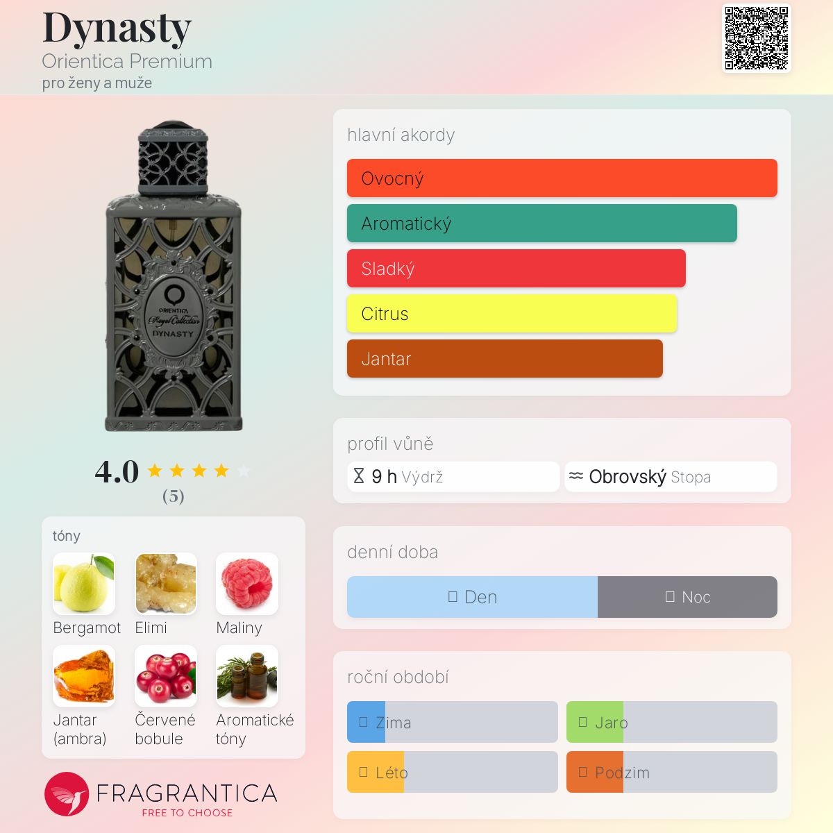 Dynasty podle Orientica Premium je vůně pro ženy a muže. Toto je nová vůně. Dynasty byl/a uveden/a v roce 2025. Vrchní tóny jsou Bergamot, Elimi a Červené bobule; střední tóny jsouAromatické tóny, Pačuli a Vetiver ; základní tóny jsou Maliny, Jantar (ambra) a Pižmo.