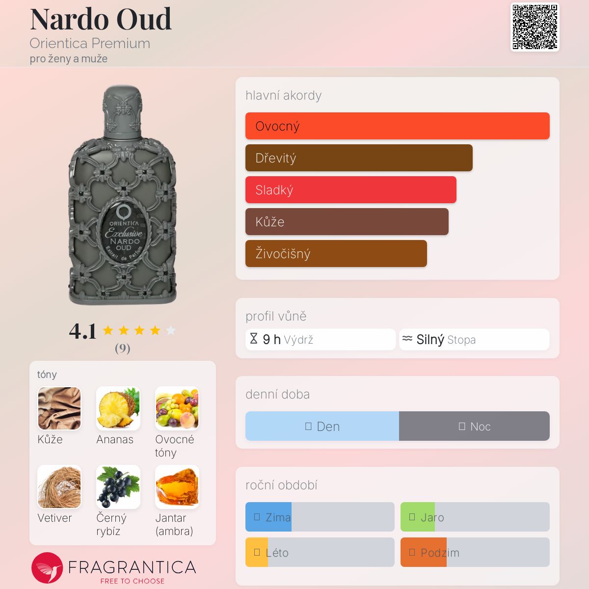 Nardo Oud podle Orientica Premium je Floral Fruity vůně pro ženy a muže. Toto je nová vůně. Nardo Oud byl/a uveden/a v roce 2025. Vrchní tóny jsou Ananas a Ovocné tóny; střední tóny jsouVetiver, Černý rybíz a Růže ; základní tóny jsou Kůže, Jantar (ambra) a Suché dřevo.